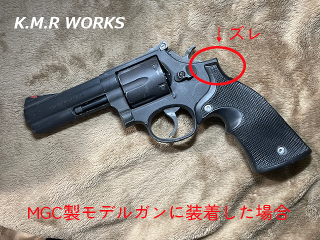 MGC製のM586でも装着自体はできますが、画像の通り一部ぴったりと合わない箇所がございます。